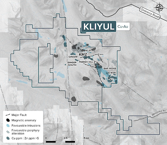 100% owned by Pacific Ridge, Kliyul is located in the prolific Quesnel Terrane close to existing infrastructure. The Kliyul Main Zone ("KMZ") hosts 334.1 million tonnes (“Mt”) grading 0.33% copper equivalent (“CuEq”)*, 0.15% copper, 0.26 g/t gold, and 0.95 g/t silver, or 2.42 billion pounds CuEq*, which includes 1.11 billion pounds of copper, 2.74 million ounces of gold and 10.22 million ounces of silver, in the Inferred Mineral Resource category (see news release dated September 18, 2025) and remains open for expansion. KMZ is just one target area along an underexplored 6-km long mineralized trend (see Figure 2).